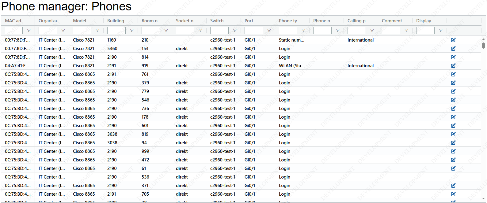 - Comment: The comments entered for the telephone are displayed in the comment column.