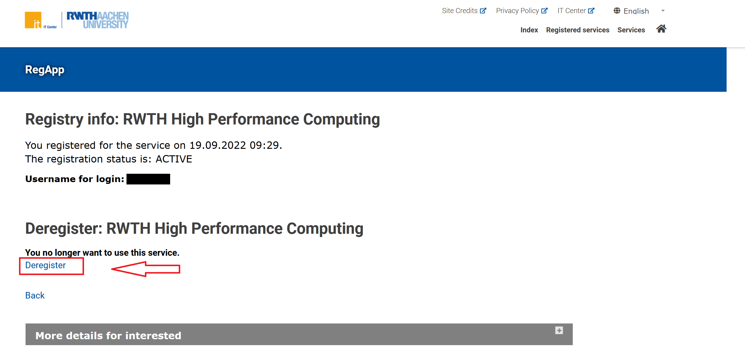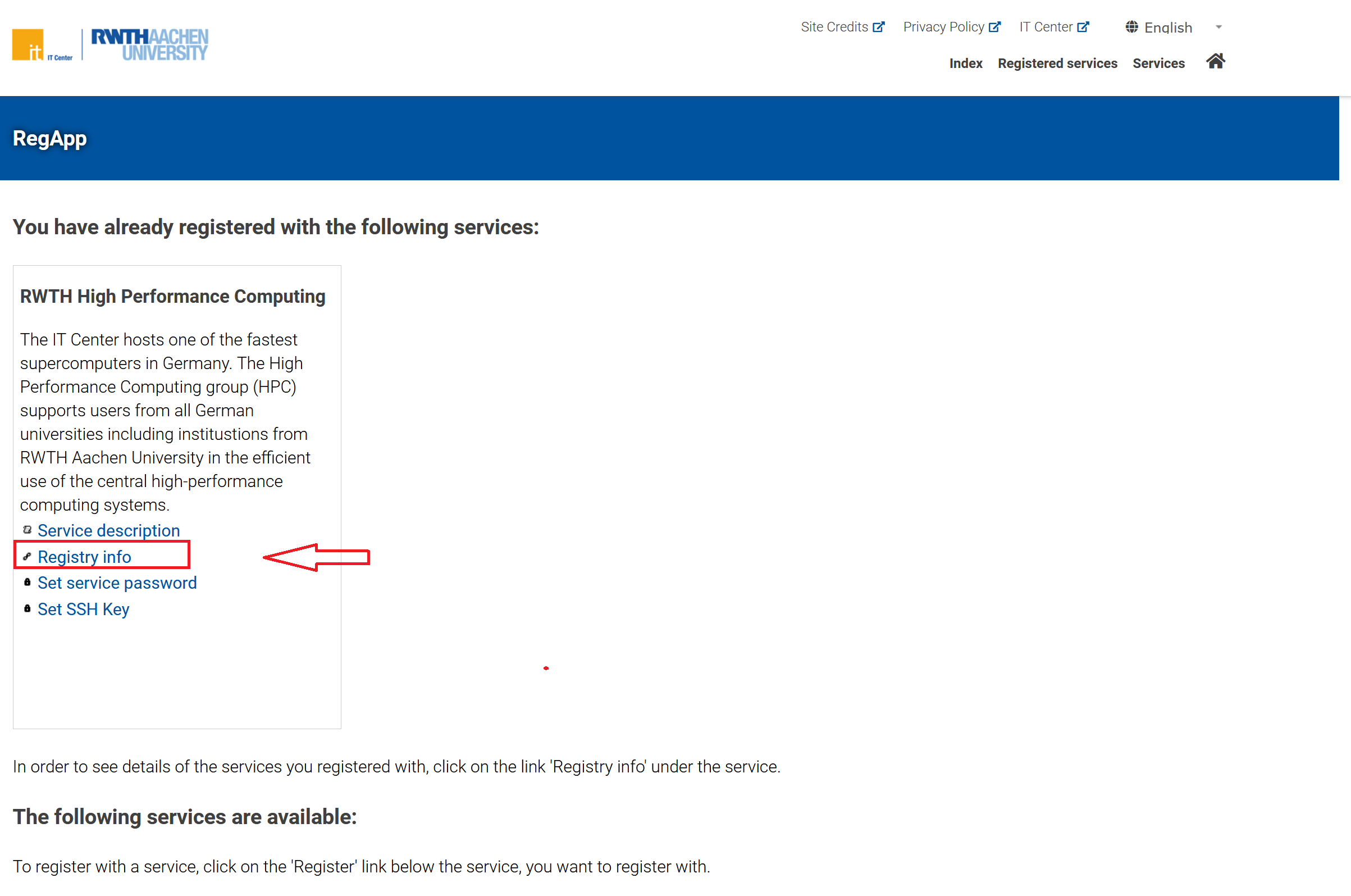 - Navigate to Registered Services → RWTH High Performance Computing → Registry Info