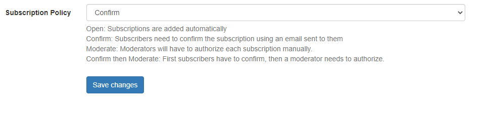 Confirm, then Moderate combines the two options above. Potential new subscribers must first answer a confirmation email and then be allowed to join the list by an administrator.