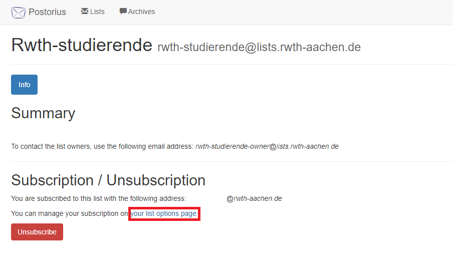 As a subscriber of a list, you will be sent to the following page. On this page you can cancel your subscription or change the settings for that list. For the latter, please click on “your list options page”.