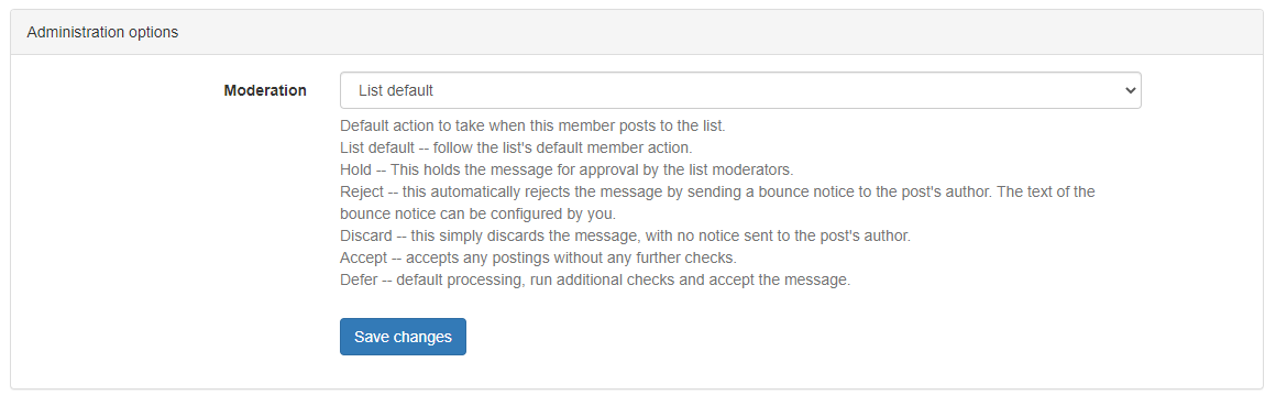 This page allows changing the settings to “accept”, which will allow the non-member to send to the list.