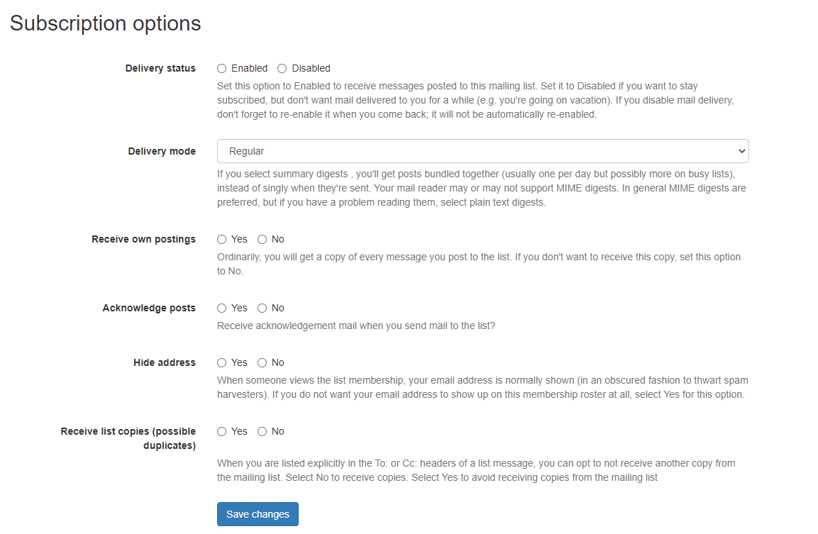 You can also see the subscription settings here. Generally, if there are no applicable mailman settings, global settings apply instead.
