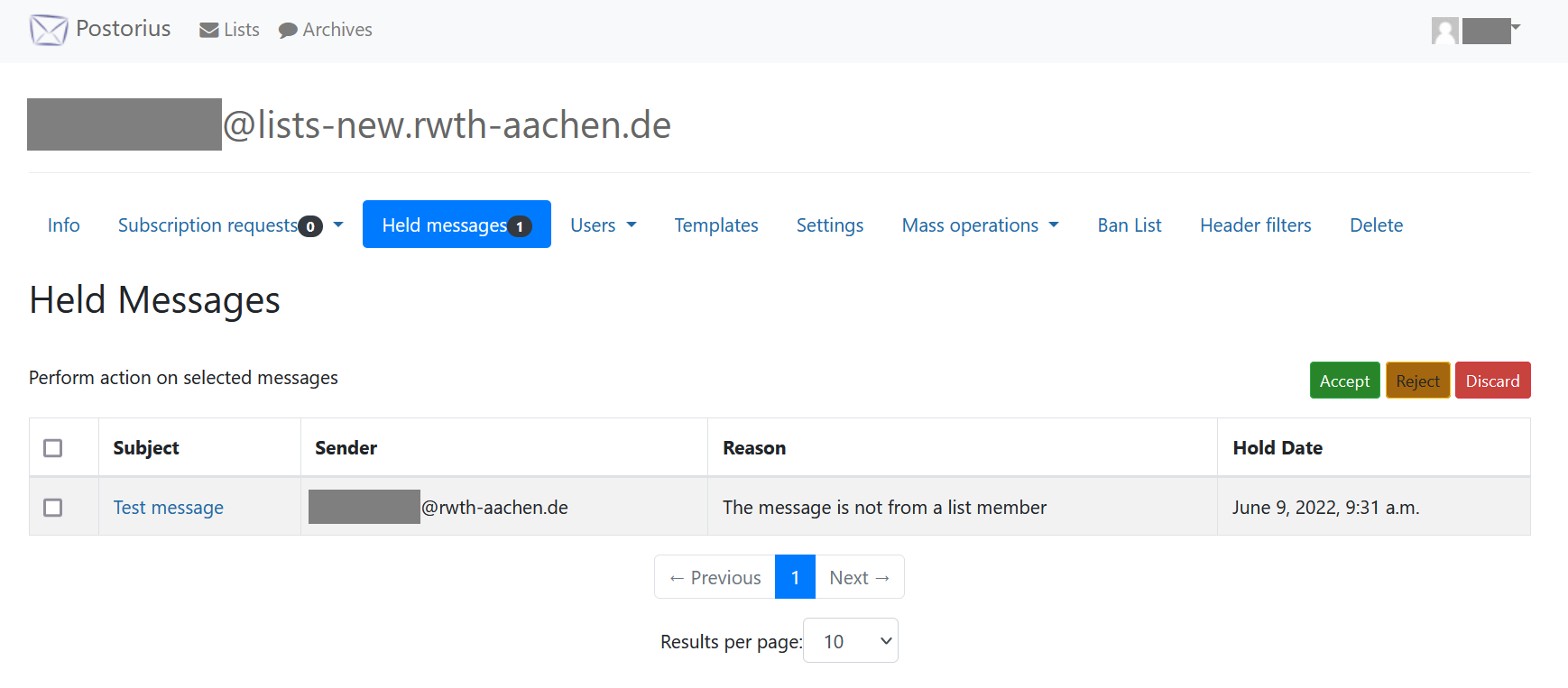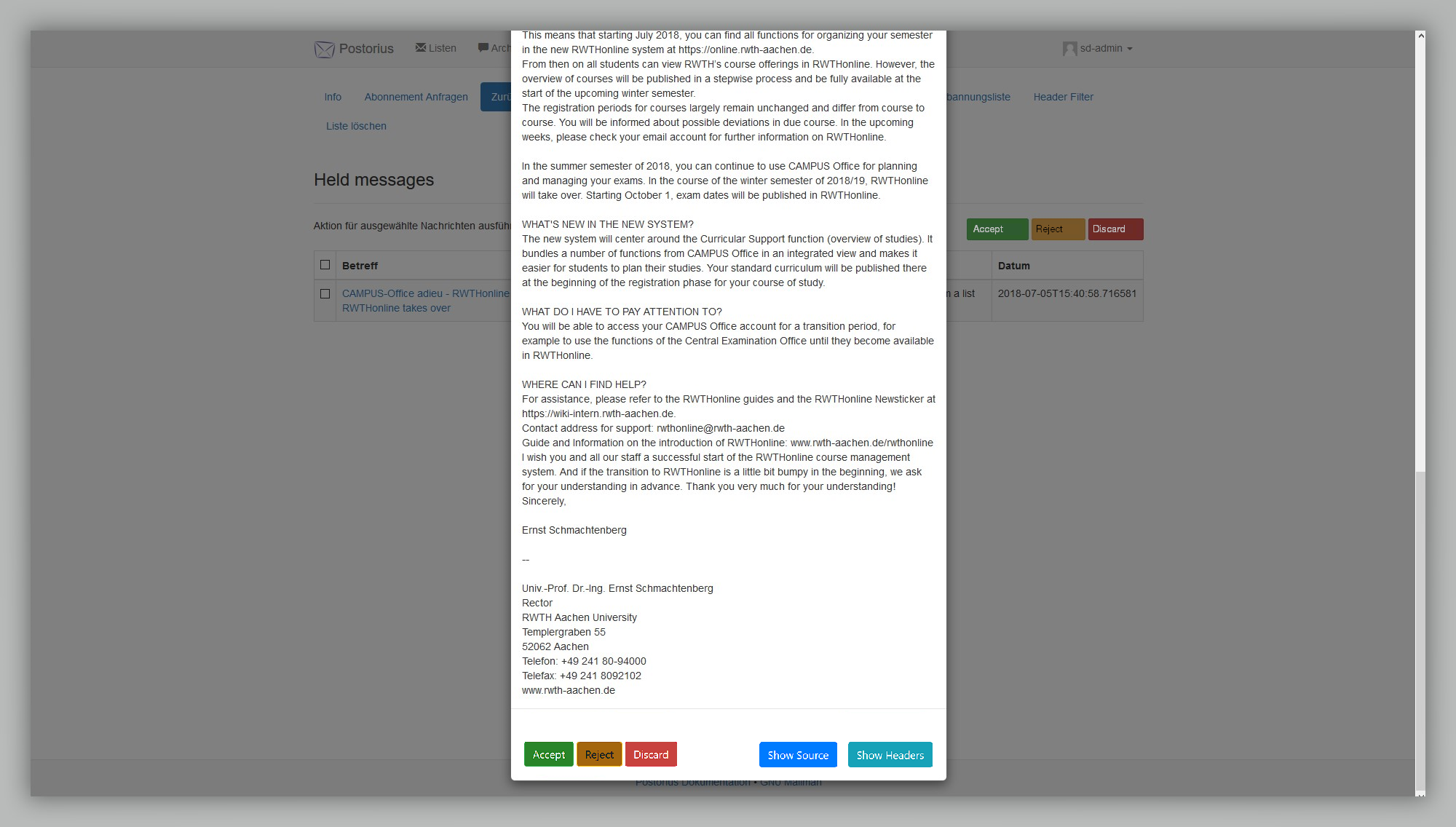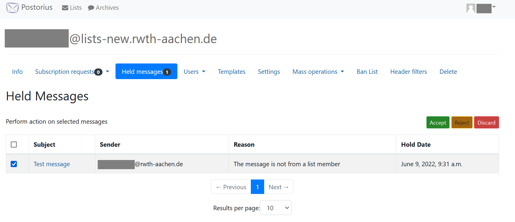 As soon as the Data of held-back messages is checked thoroughly, you can set them for release. Simply choose the mail for an action by ticking the box on the left and clicking on accept. Successful completion of the operation will be indicated by a green bar appearing after the mail is sent.