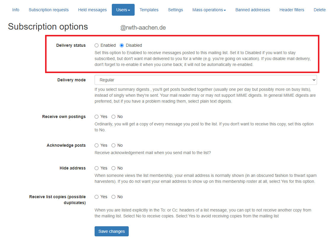 If you intend to change the settings for specific users, this option is also available in the user settings. This can be useful if, for example, you wish to grant a single user permission to send messages to a list which usually does not receive messages.