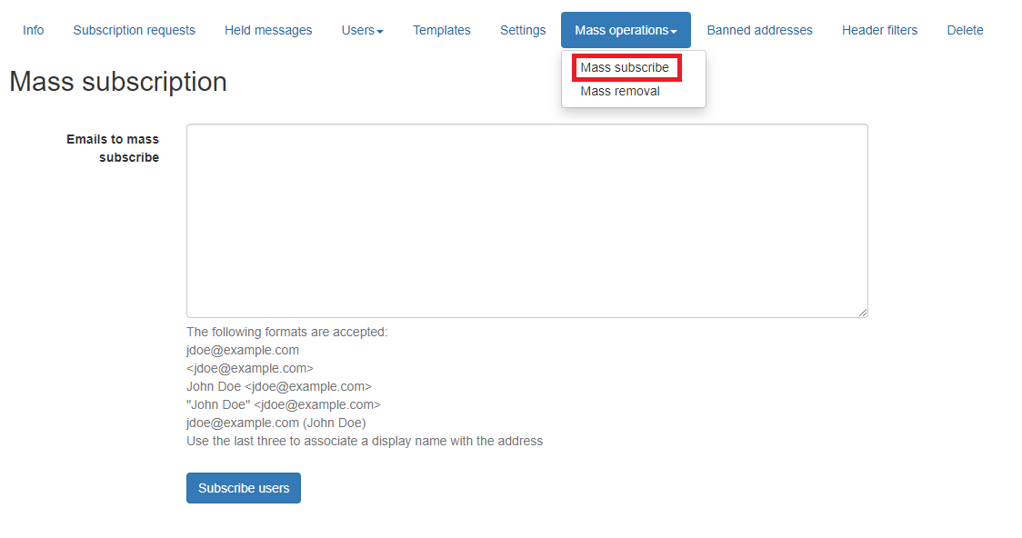 New subscribers can be added using the option “mass operations > mass subscribe”. Please only enter one e-mail address per line.