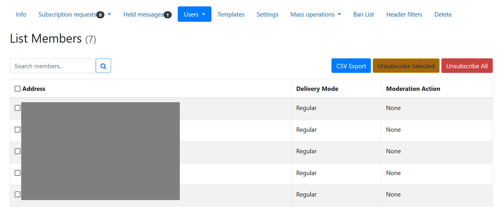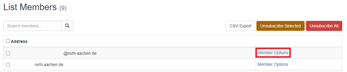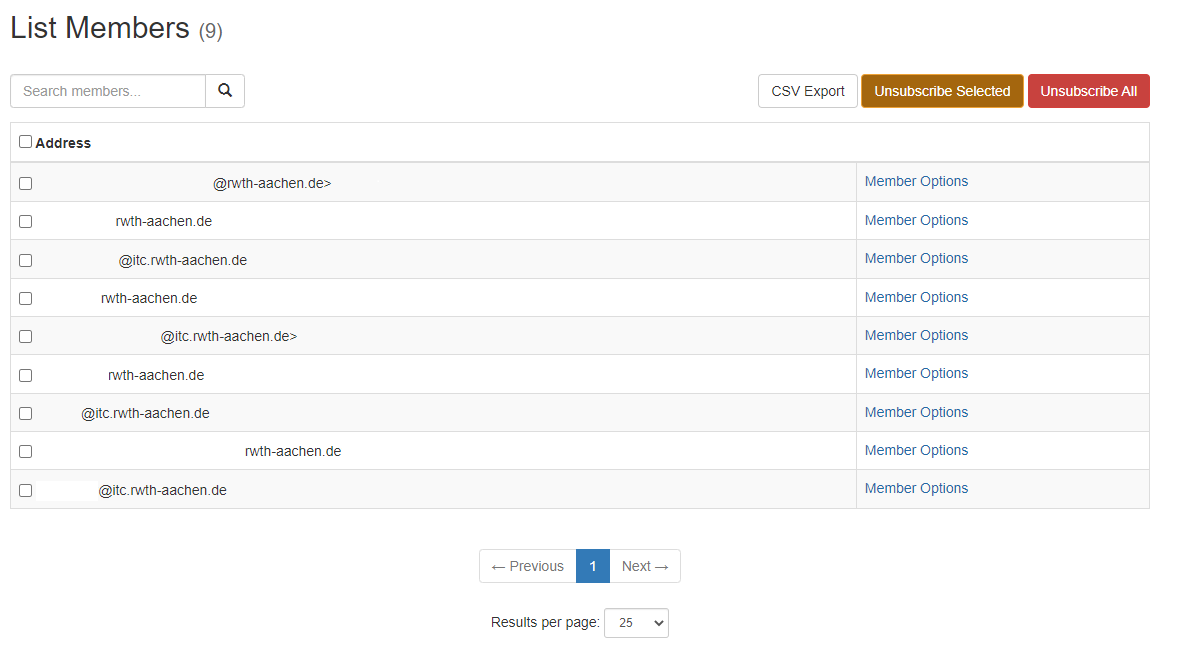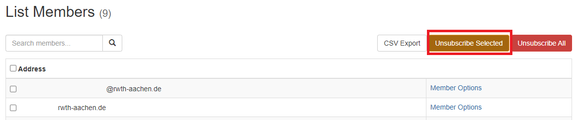 To remove members from a list, check the mark next to the members in question and click on “unsubscribe selected”.