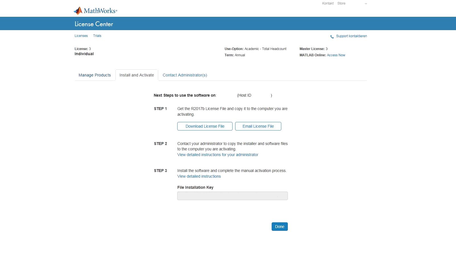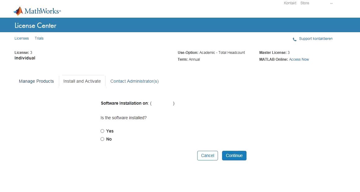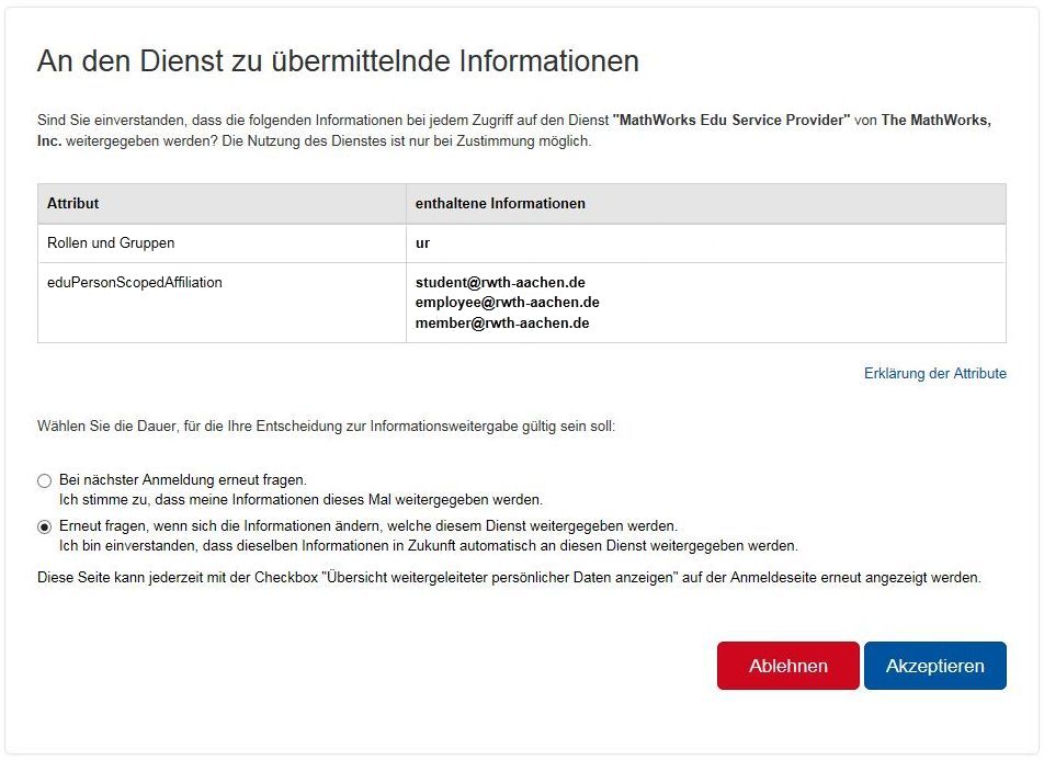 Now you can see the data you are providing to MATHWORKS. Please choose Akzeptieren to establish the Connection.