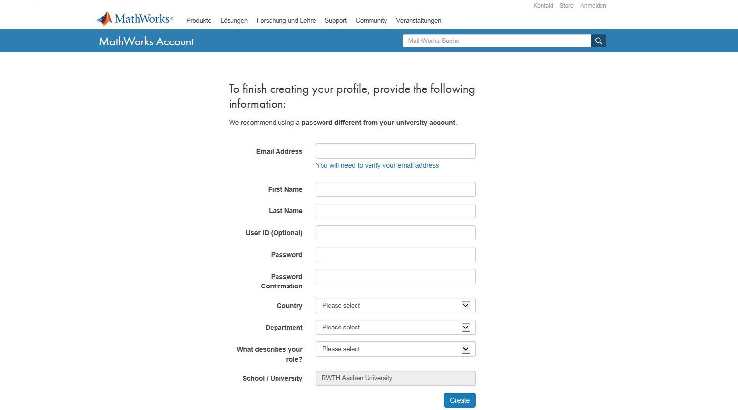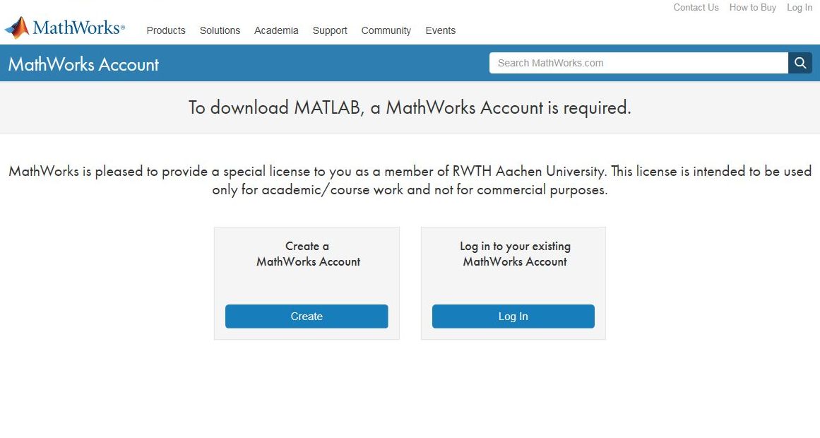 After you have connected your RWTH Account with MathWorks, you have two Options: Create a new MathsWorks account or log in with your old MathWorks account . To create a new account choose Create.