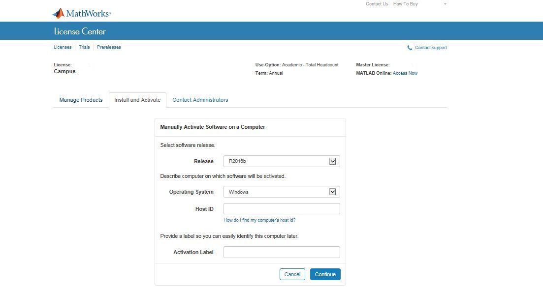 Enter your Matlab version, operating system and the Host ID (MAC-Address of the network interface card) to generate a license file.