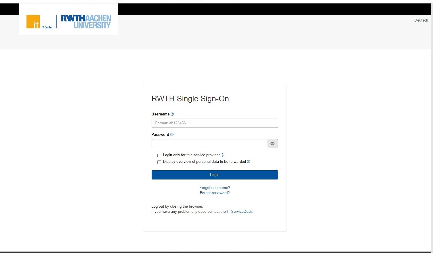 - The login works with your username (format: ab123456) and the password for the RWTH Single Sign-On Account (SSO).