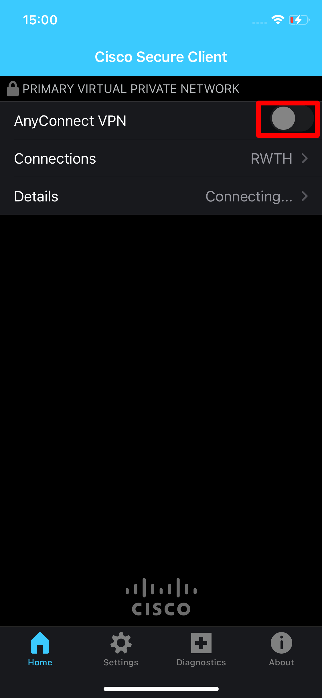 8. You can activate the VPN connection by using the slider next to "AnyConnect VPN".