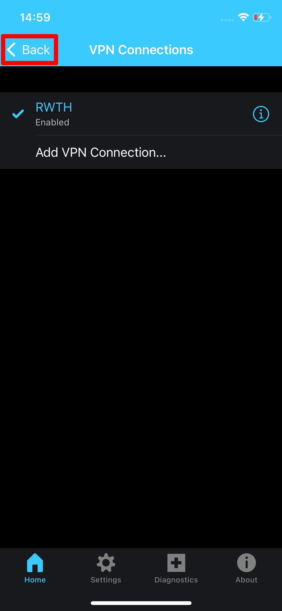 7. The VPN connection should now show as enabled. You can select "Back" to return to the main menu of the app.