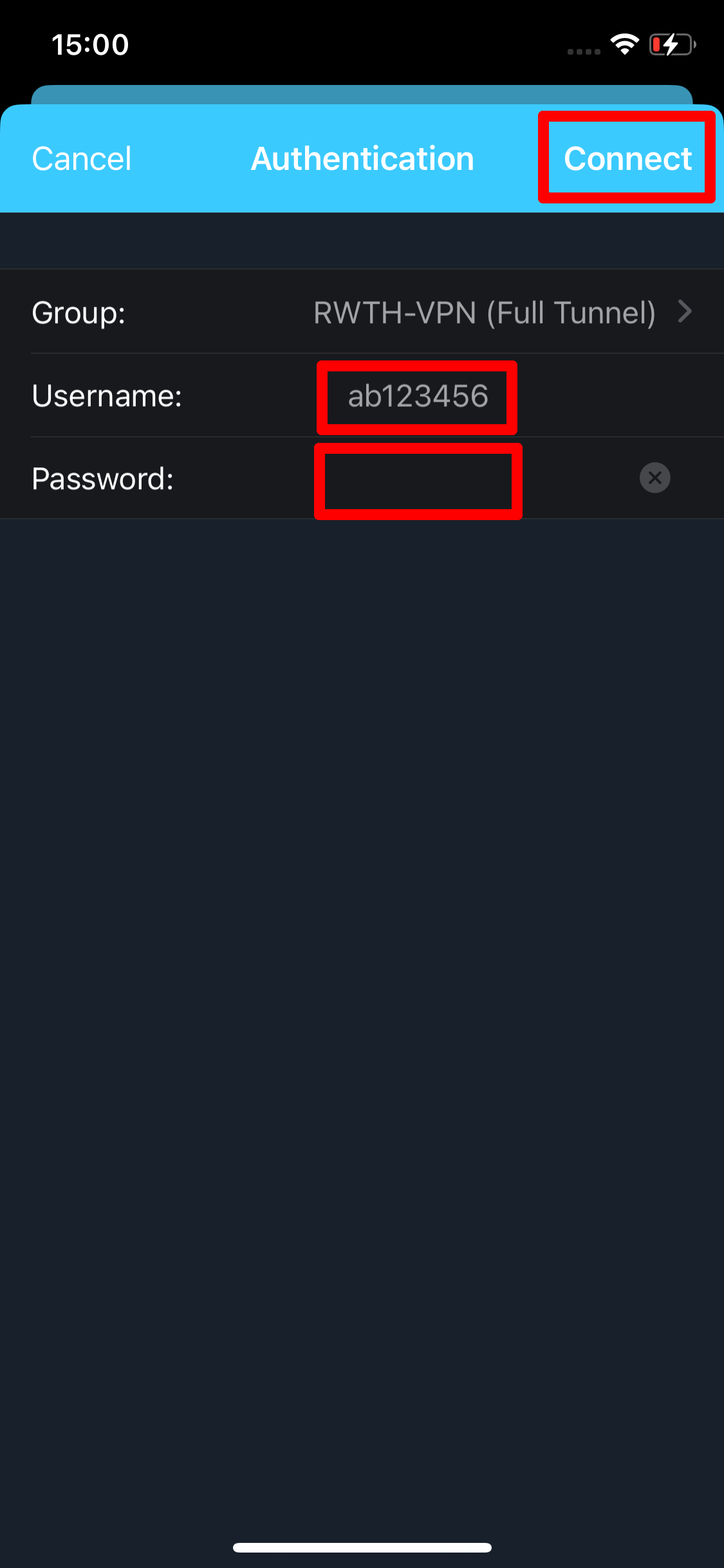 The group "Full Tunnel" is selected automatically by AnyConnect. Select "Connect" to establish a connection to the VPN.