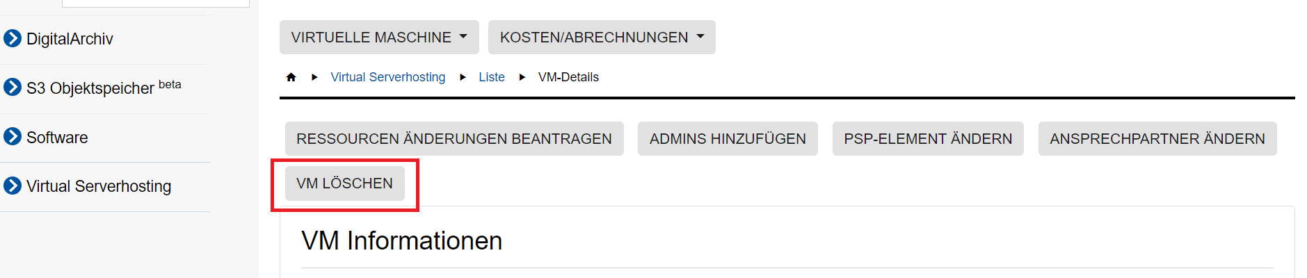 Sie dürfen für die VMs Ihrer Einrichtung einen Antrag mit bitte um Löschung stellen. Dafür gibt es auf der Infoseite der virtuellen Maschine den Button „VM Löschen“.