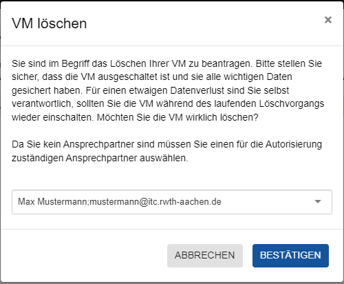 Sollten Sie ein*e Ansprechpartner*in der VM sein so ist ihr Antrag nach einem Klick auf „Bestätigen“ bereits autorisiert und es wird innerhalb kurzer Zeit bereits damit begonnen die VM abzubauen.