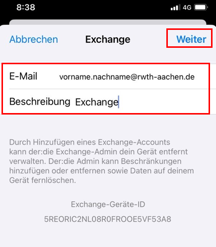 Geben Sie Ihre E-Mail-Adresse (im Format vorname.nachname@rwth-aachen.de oder name@mustereinrichtung.rwth-aachen.de) und einen beliebigen Namen für das Postfach ein.