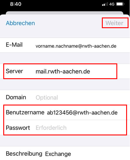 Geben Sie dann den Benutzernamen (im Format ab123456@rwth-aachen.de oder ab123456@mustereinrichtung.rwth-aachende) und die nachfolgenden Servereinstellungen ein.