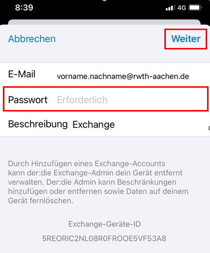 Geben Sie das Passwort für den gewünschten RWTH-E-Mail-Account ein.
