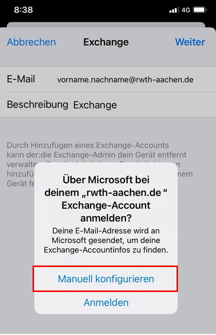 Melden Sie sich am Exchange-Account an und wählen Sie Manuell konfigurieren.