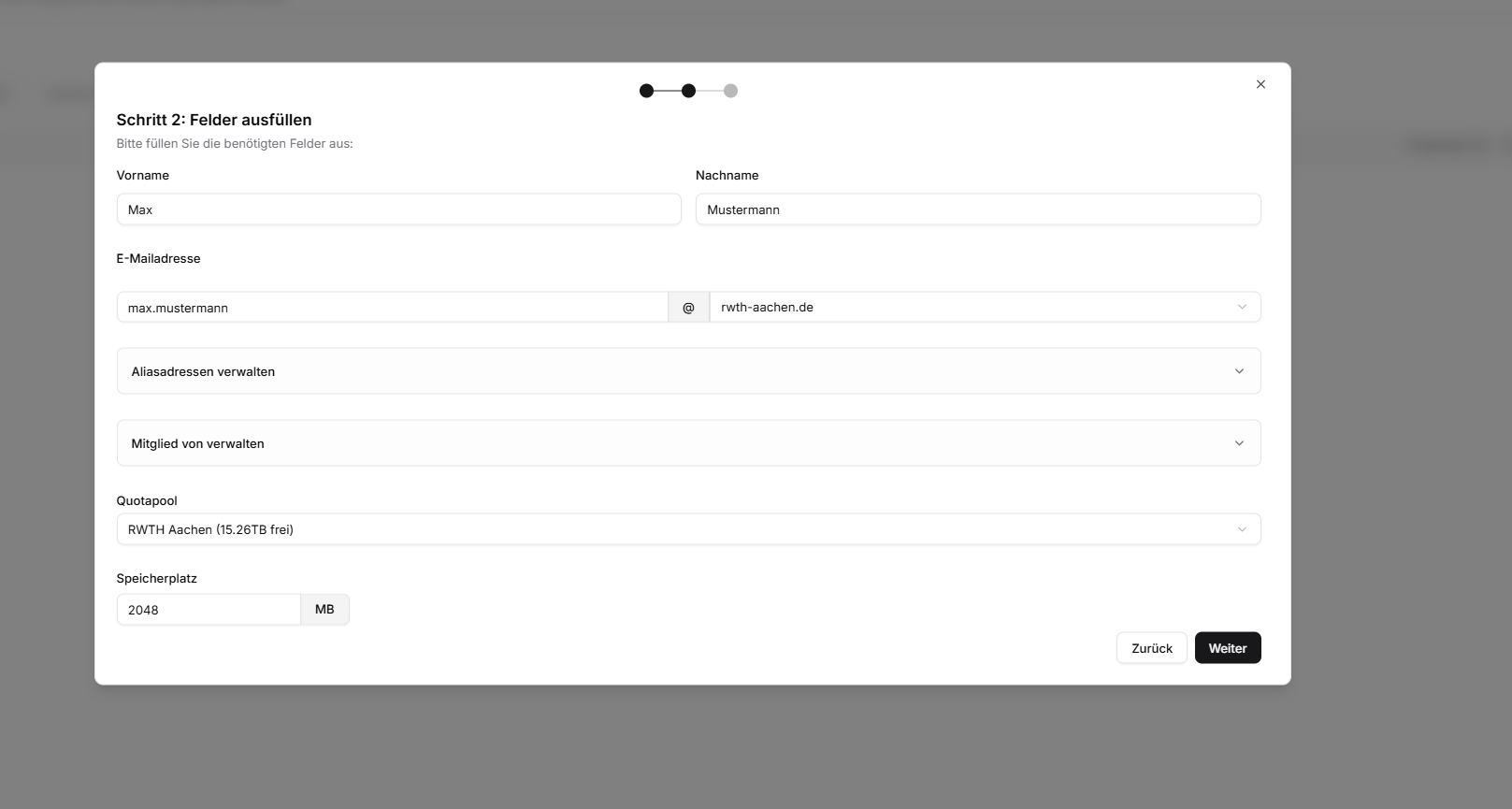 Nach Eingabe der nötigen Informationen, besteht die Möglichkeit das Postfach mit einer existierenden PVZID (Mitarbeitende der RWTH) oder der Matrikelnummer (Studierende der RWTH) aus dem Identity Management zu verknüpfen.