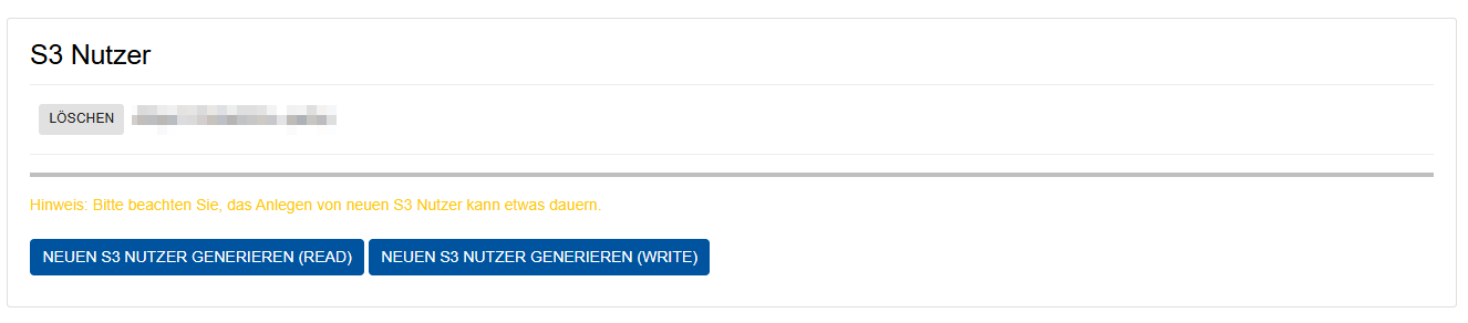 Hier können Sie anonyme s3-Nutzerdaten anlegen oder bestehende Nutzer löschen. Sie können unterscheiden, ob diese nur lesenden (read only) oder schreibenden (write) Zugriff auf den Bucket haben sollen.