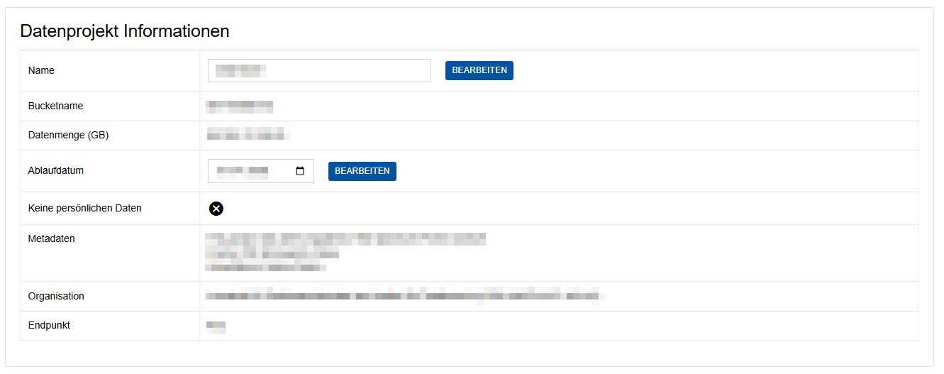 Sie können jederzeit den Namen und das Ablaufdatum des Datenprojektes editieren (es sind nur Verlängerungen möglich; der Maximalwert beträgt 10 Jahre)