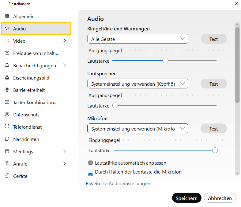 Klicken Sie auf Erweiterte Audioeinstellungen um das entsprechende Fenster auf dem folgenden Bild zu öffnen. Hier haben Sie die Möglichkeit, die Audiosignalverarbeitung einzustellen. Wenn die Option Automatisch ausgewählt ist, legt Webex fest, ob die integrierte Windows-Audiosignalverarbeitung umgangen wird. Diese Festlegung basiert auf dem, was für Ihr Gerät am besten funktioniert. Sie können auch die Option Verwenden auswählen, um die Windows-Audiosignalverarbeitung zu verwenden oder Sie können die Option Umgehen auswählen, um sie zu umgehen und den Ursprungs-Audio-Stream vom Audiotreiber zu erhalten. Nach Auswahl der von Ihnen gewünschten Option, klicken Sie auf Speichern um diese abzuspeichern.