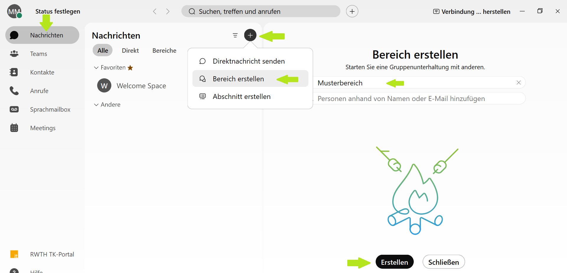 Ein Bereich ist äquivalent zu einem Gruppenchat und eignet sich beispielsweise gut für eine Gruppe von Personen, die an einem bestimmten Thema arbeiten.