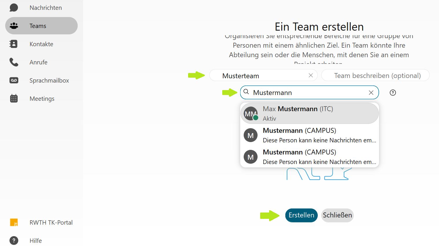 Die Person, die den Bereich erstellt hat, kann sich dort auch direkt die Moderation zuweisen. Die Moderation wird jedoch nicht automatisch vergeben (so wie das beim Erstellen eines Teams der Fall ist).