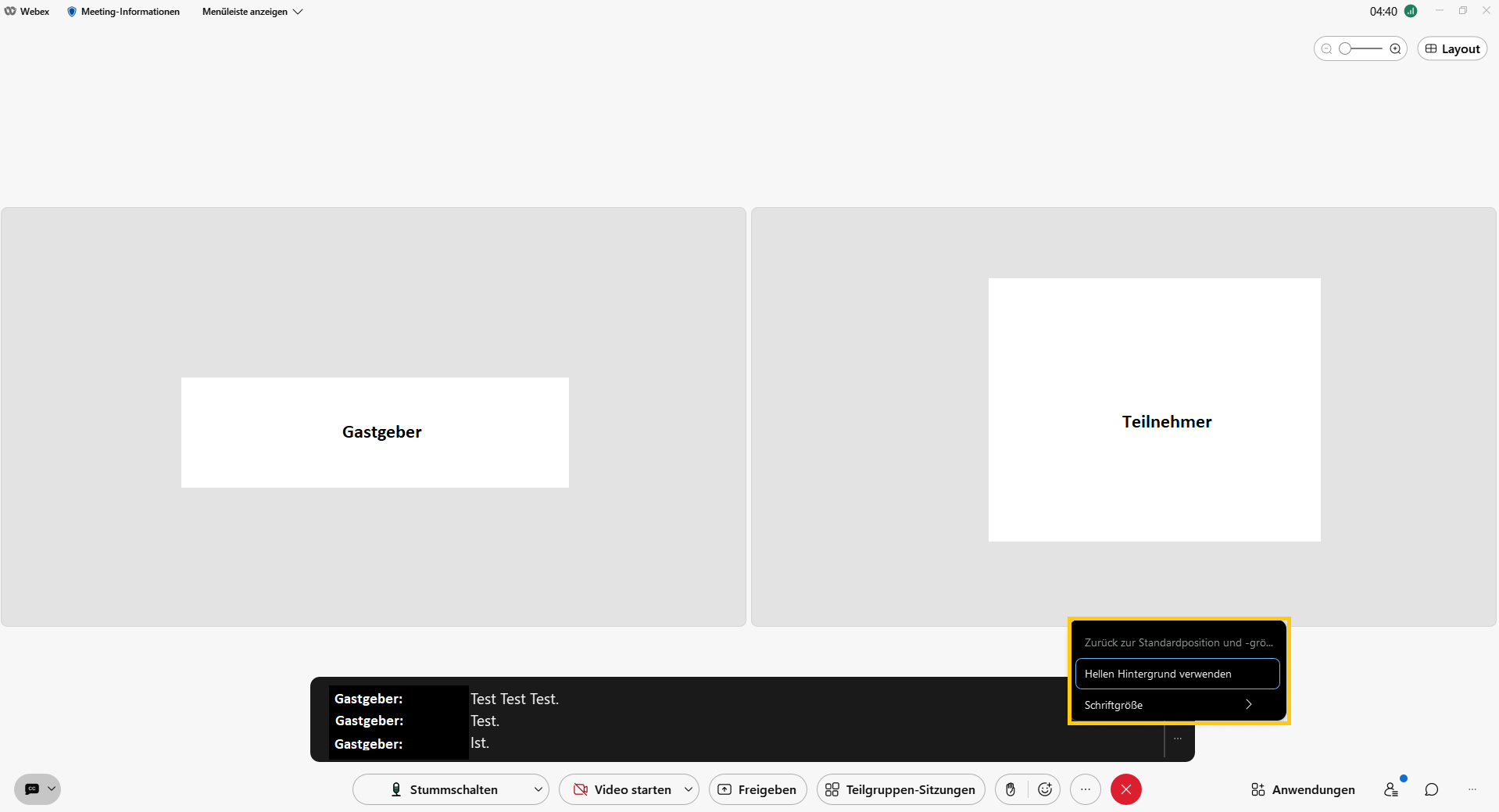 Um Ihre Meetings barrierefrei abzuhalten, können Sie die Untertitelfunktion einschalten, so dass das Gesagte automatisch in Textform angezeigt wird.