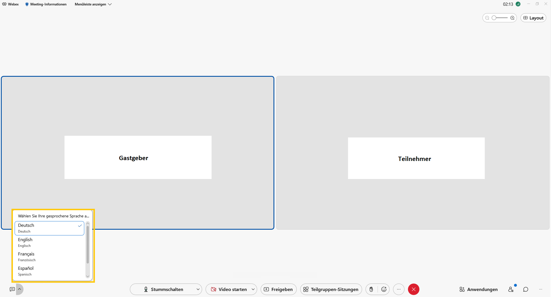 Durch Klick auf den kleinen Pfeil, kann der Gastgeber die Sprache der Untertitel einstellen: