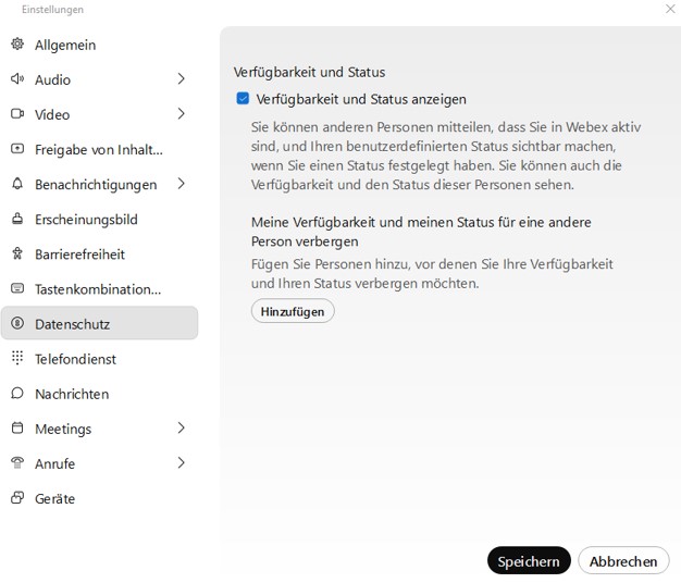 In den Einstellungen zum Datenschutz können Sie Ihre Verfügbarkeit und Ihren Status ein- oder ausschalten.