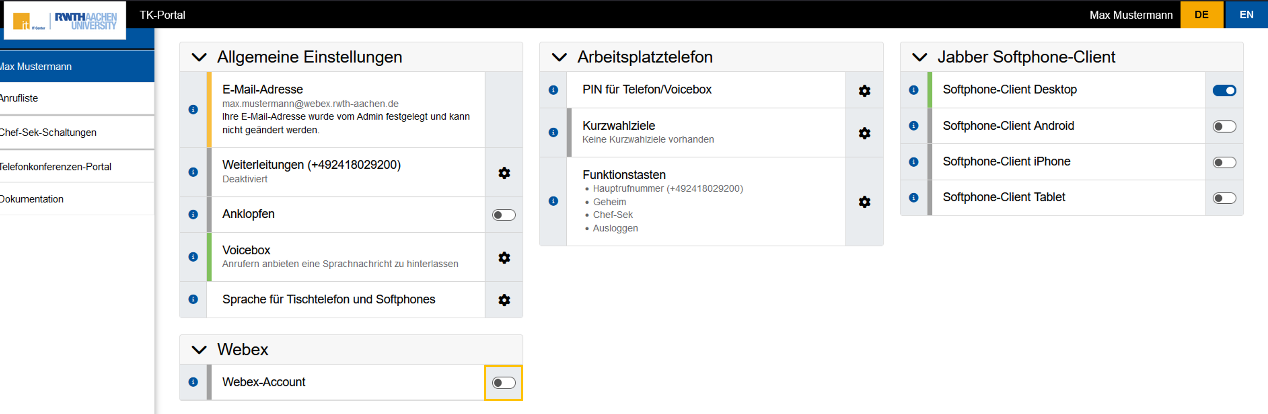 Klicken Sie im TK-Portal unter dem Reiter Webex auf den Schieberegler neben "Webex Account".