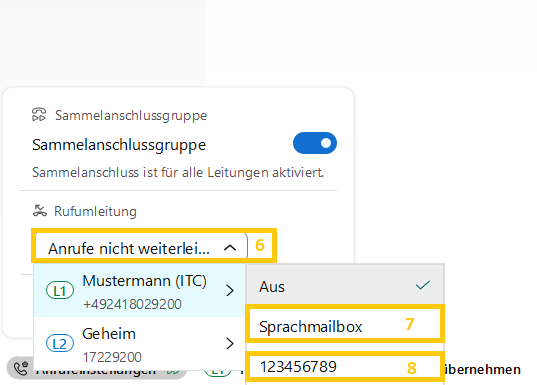 Um nun die Rufumleitung zu aktivieren, öffnen Sie erneut die Anrufeinstellungen (1) der Benutzeroberfläche. Wählen Sie über den Button unter Rufumleitung (6) die Leitung aus, für die Sie eine Umleitung eintragen möchten. Klicken Sie im sich öffnenden Fenster auf Sprachmailbox (7), um einkommende Anrufe direkt an Ihre Mailbox weiterzuleiten. Hierzu müssen Sie vorher Ihre Sprachmailbox (Voicebox) im TK-Portal aktiviert haben. Die entsprechenden Anleitung finden Sie im Menüpunkt Webex Benutzeroberfläche unter dem Punkt Sprachmailbox. Sofern die Anrufe an eine bevorzugte Rufnummer umgeleitet werden sollen, so wählen Sie eine der angezeigten Telefonnummern (8) aus.