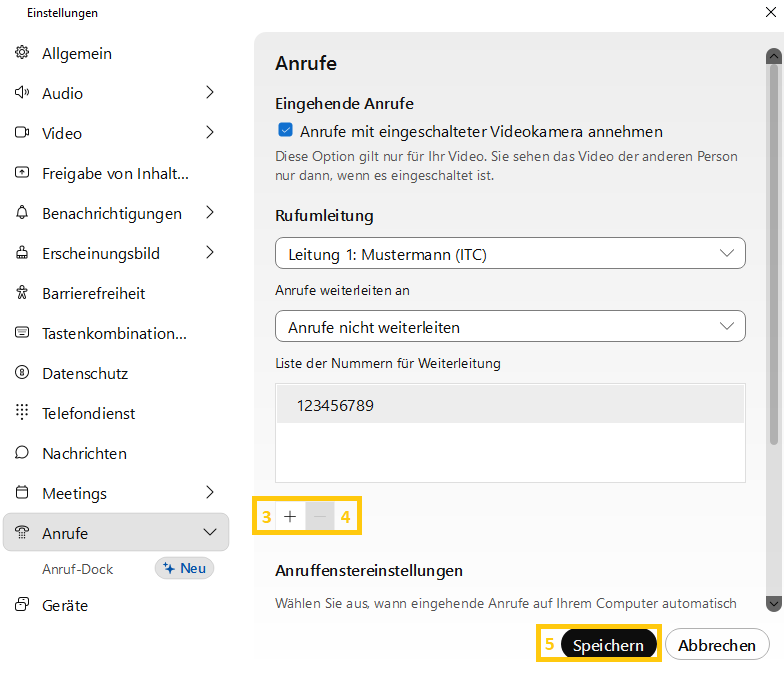 Im sich öffnenden Einstellungsmenü können Sie nun Telefonnummern für Ihre Rufumleitung hinzufügen, indem Sie auf den Plusbutton (3) klicken, die Nummer eintippen und auf Enter drücken.