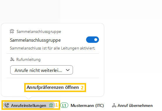 Um eine Rufumleitung in Webex einzurichten, klicken Sie auf der Benutzeroberfläche auf Anrufeinstellungen (1). Standardmäßig ist dies am unteren linken Rand der Benutzeroberfläche zu finden. Wählen Sie anschließend Anrufpräferenzen öffnen (2) aus.
