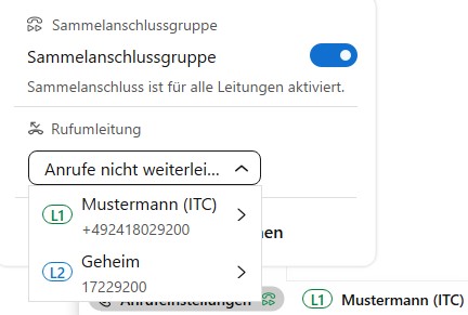 Zudem haben Sie hier die Möglichkeit, Ihre Sammelanschlussgruppe zu aktivieren oder zu deaktivieren. Wenn Ihr Administrator Sie als Mitglied eines Sammelanschlusses eingerichtet hat, werden Sie benachrichtigt, wenn ein Anruf bei dieser Sammelanschlussnummer eingeht und können den Anruf von dort aus annehmen.