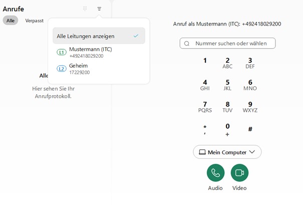 Hier finden Sie die Anzeige und Auswahlmöglichkeit der gewünschten Leitung, sofern eine weitere Leitung vorhanden ist.