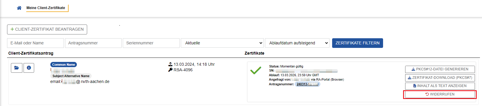 Sie können Ihre Client-Zertifikate über das RA-Portal widerrufen: