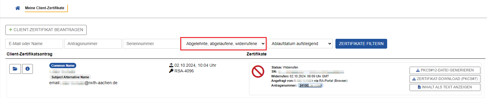 Widerrufene Zertifikate können wie folgt im RA-Portal angezeigt werden: