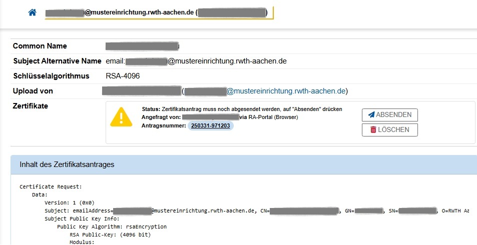 - Durch Klick auf den Button Zertifikatsantrag erst anzeigen, können Sie Ihren Antrag nochmal prüfen bevor Sie diesen an die CA absenden.