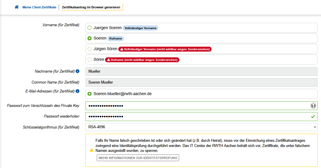 - Für persönliche E-Mail-Adressen können Sie zwischen Ihren vollständigen Vornamen oder Ihren Rufnamen wählen. Diese werden aus dem Identity Management übernommen, sobald Sie ein E-Mail-Konto ausgewählt haben. z.Z. werden Umlaute und andere besondere Zeichen von der CA (Harica) nicht unterstütz, d.h. das RA-Portal transkribiert diese.