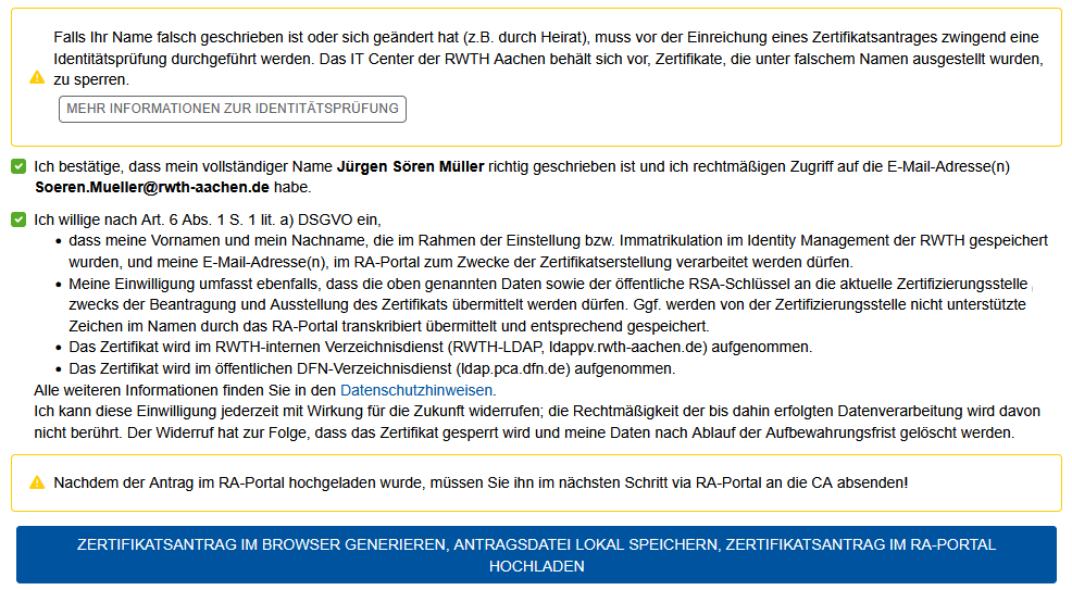 - Sie nehmen zur Kenntnis, dass Ihr Zertifikat im RWTH-LDAP (RWTH-interner Verzeichnisdienst) aufgenommen wird.