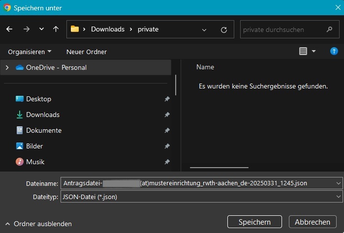 - Antragsdatei lokal speichern: Hier wird die .json-Datei lokal auf Ihren Rechner gespeichert.