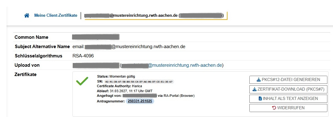 Im RA-Portal wird ein grüner Haken neben dem Zertifikats-Status angezeigt. Es ist jetzt möglich, Ihr Zertifikat herunterzuladen.