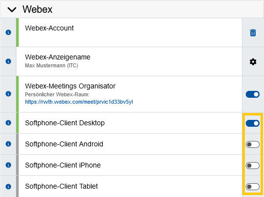 Aktivieren Sie im Teilmenü für den Webex-Client den Softphone-Client durch Klicken auf den entsprechenden Schieberegler für das zu nutzende Gerät. Es können mehrere Softphone-Clients gleichzeitig aktiviert sein.