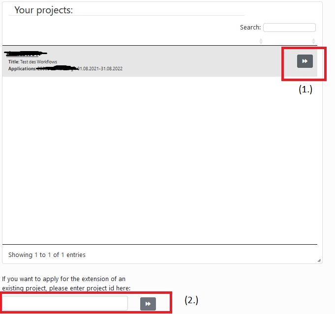The longest project period is a year (12 months). If your project lasts longer you are welcome to file in an extension project proposal by using the regular JARDS online submission system. You can find the corresponding "extend" button (1.) next to the project in your project list OR your can (2.) just type in the project id and click the button: