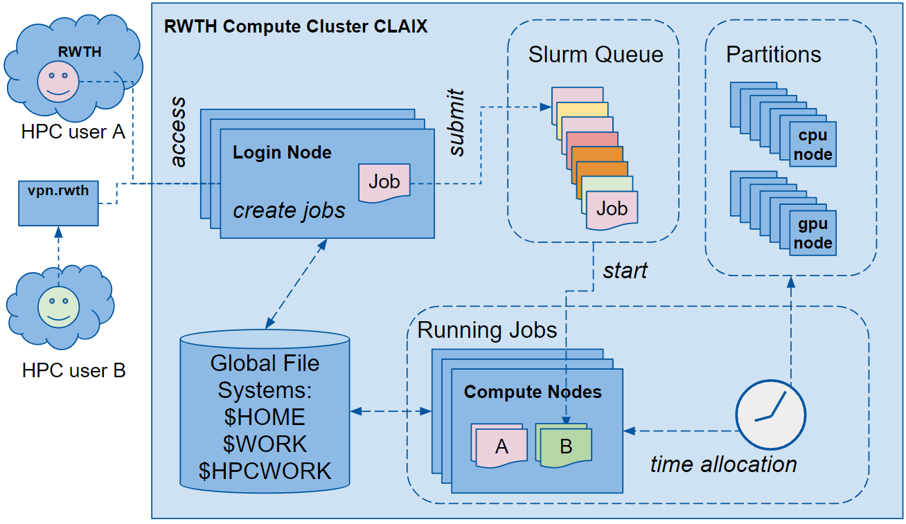 The following diagram shows a simplified view of how Slurm manages Jobs on the CLAIX Compute Cluster: