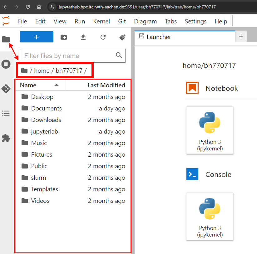 After starting a JupyterLab as described here, you can select on the top right the File Browser (shift+ctrl+F).