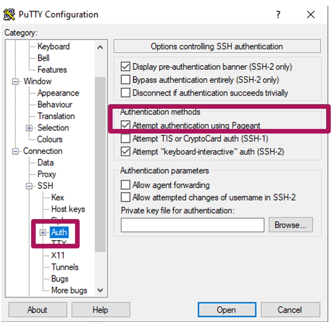 - In PuTTY, navigate to Connections → SSH → Auth and enable "Attempt authentication using Pageant".
